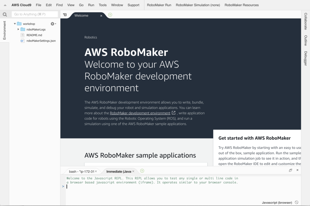 RoboMakerでの開発はCloud9で行います。画面右上にRoboMaker用のメニューが追加されています。 「RoboMaker Resources」メニューからダウンロードした「Hello World」サンプルを使ってRoboMakerの開発手法を学びました。