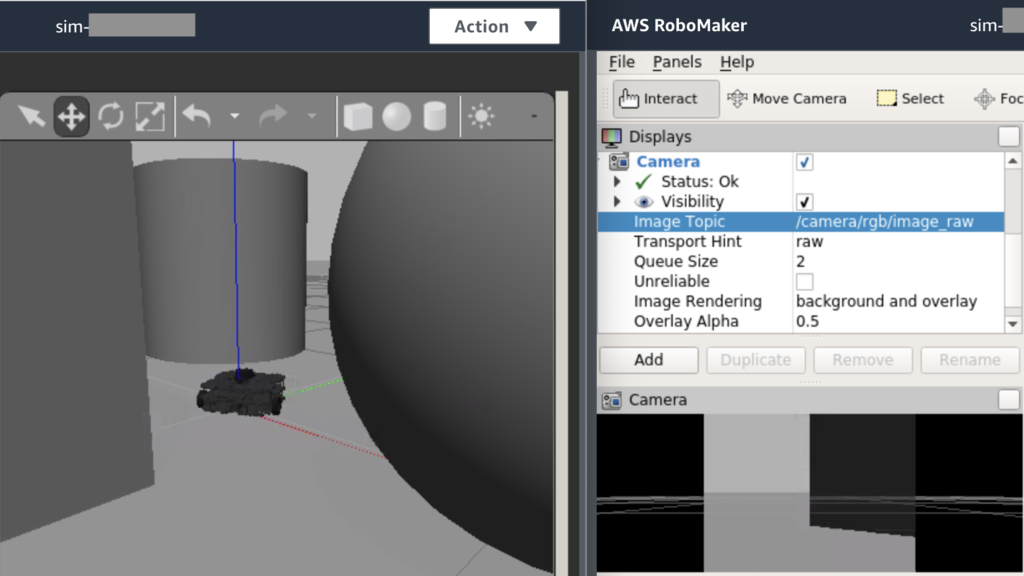 シミュレーション環境にオブジェクトを配置し、ロボットのカメラ視点を見てシミュレーションは終了です。