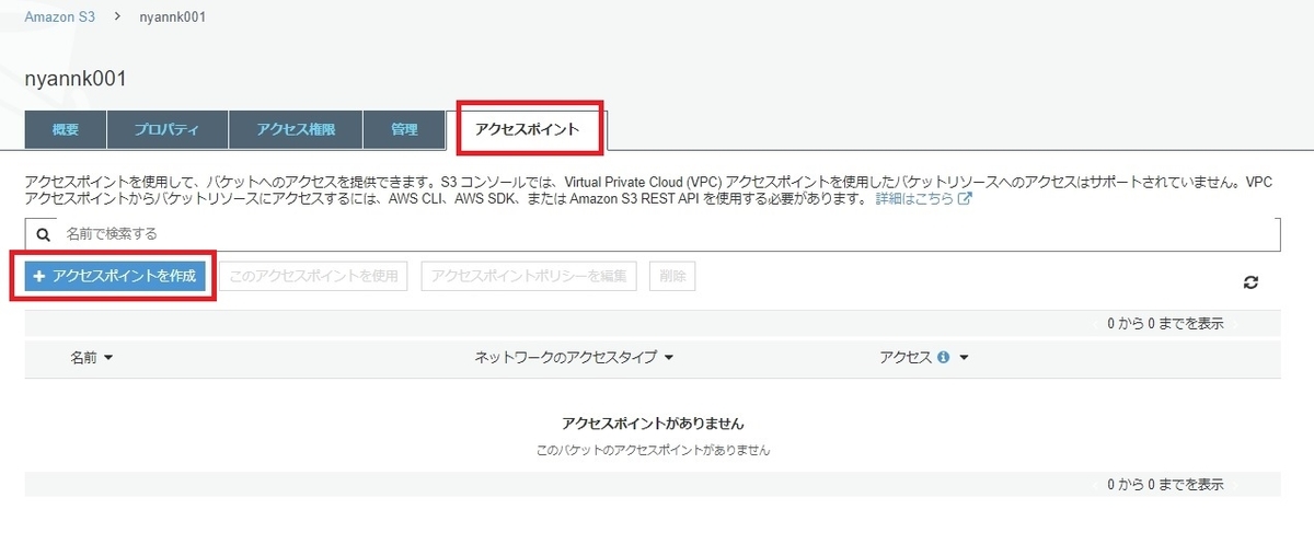 ①S3 Bucket設定にアクセスポイントタブが増えていますね。