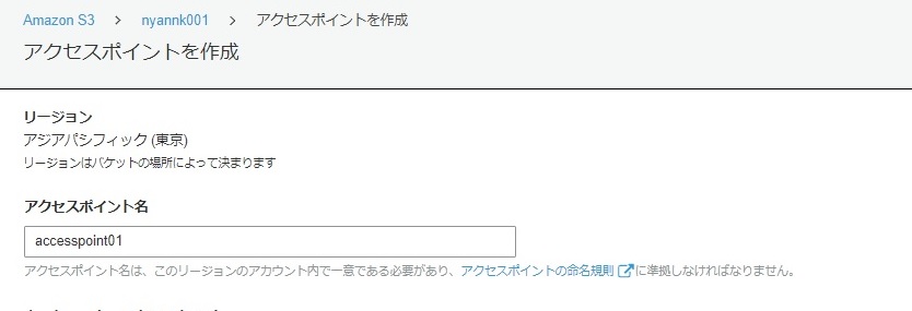 ②アクセスポイント名を入力します。アクセスポイント名はアカウント単位でリージョン内一意である必要があります。