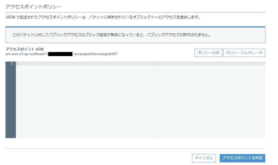 ・また今回はBucketポリシーはアクセスポイント経由でのみアクセスできるようにします。