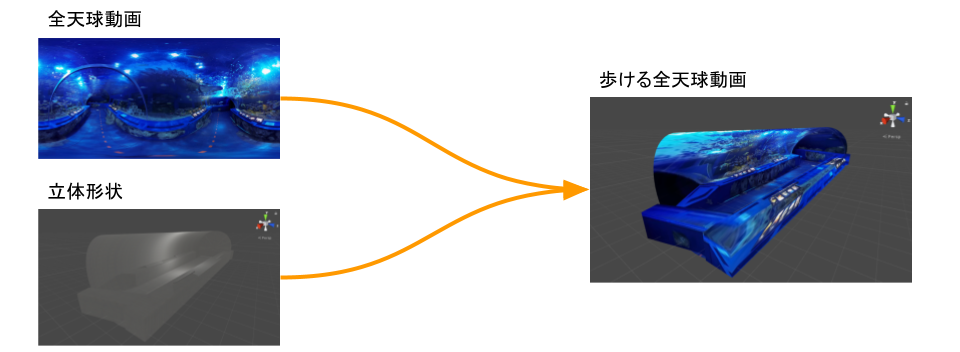 具体的には、予め作成した立体形状に、全天球動画を投影しています。