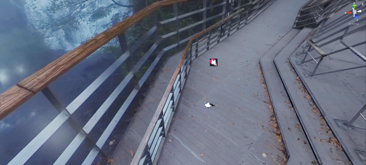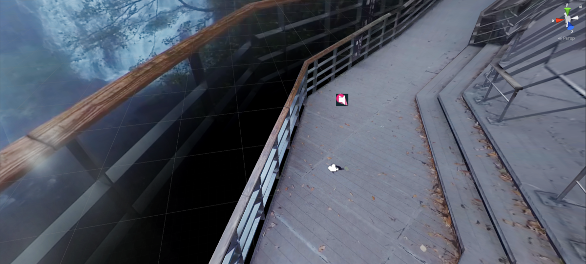 - 近景:足場と一番近くの木の幹のみ形状を作成し、水しぶきのパーティクルを追加