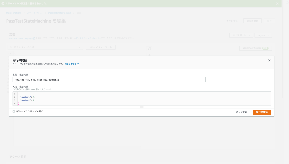 では、Workflow StudioからこちらのコードをPassステートに設定してみます。このとき、入力タブの「Parameters を使用して入力を変換」にチェックを入れ、表示されたエディタにコードを設定するようにしてください。