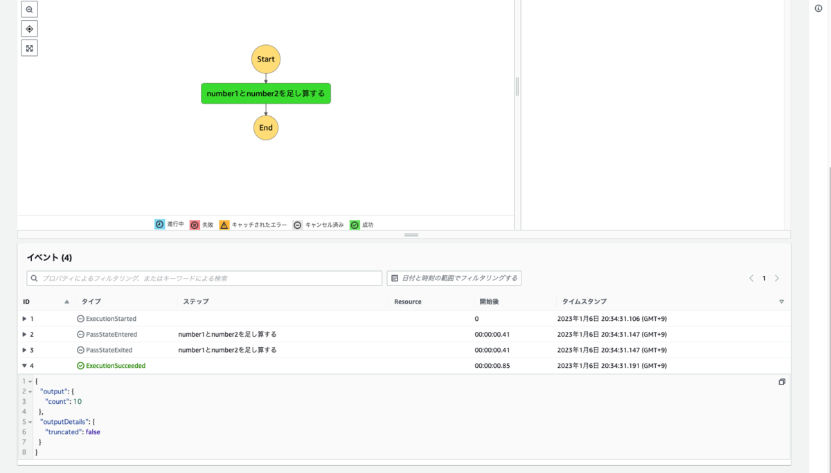 Passステートで処理された結果、出力されたデータは "count.$": "States.MathAdd($.number1, $.number2)" と定義した内容がそのまま出力されており、組み込み関数が動作せず、期待通りの動作になっていないことがわかります。