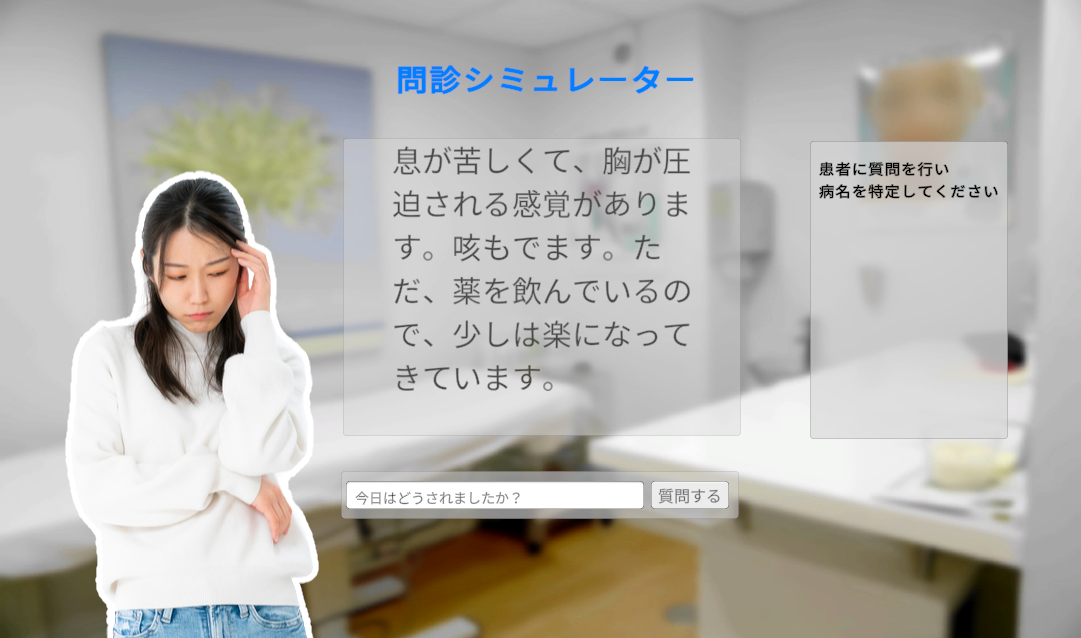 医療現場では、問診は患者の病状を正確に把握するために非常に重要な役割を果たしていますが、実際の患者さんを使って研修を行うことは難しく、コストがかかるため、研修の機会が限られていました。
