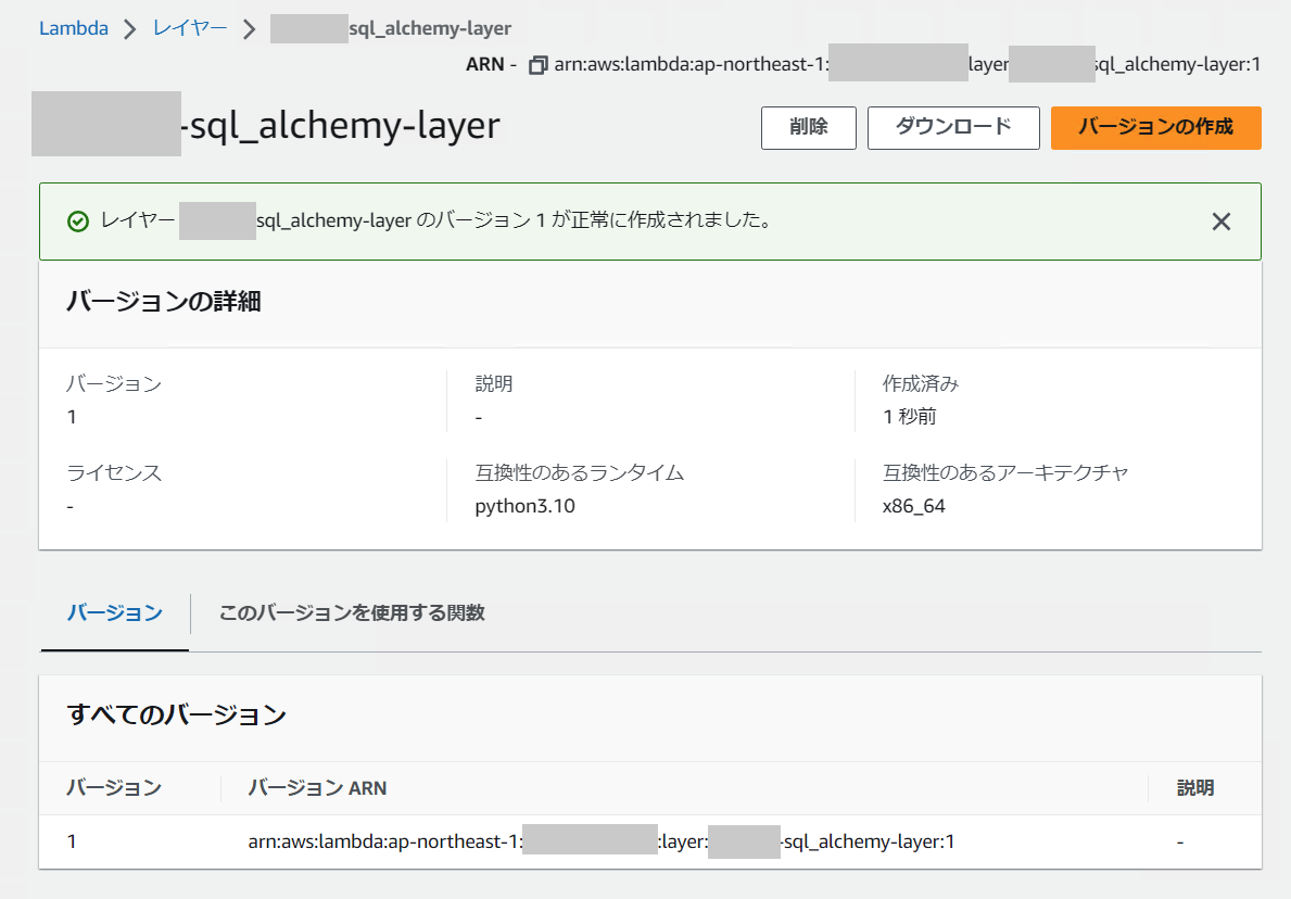 [作成] ボタンをクリックすると、Lambda レイヤーバージョン 1 ができました。