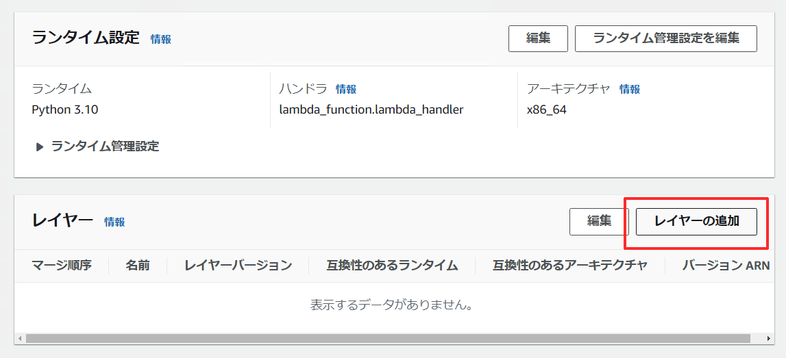 Lambda 関数のページに戻り、下部にある [Lambda レイヤーを追加] ボタンをクリックします。
