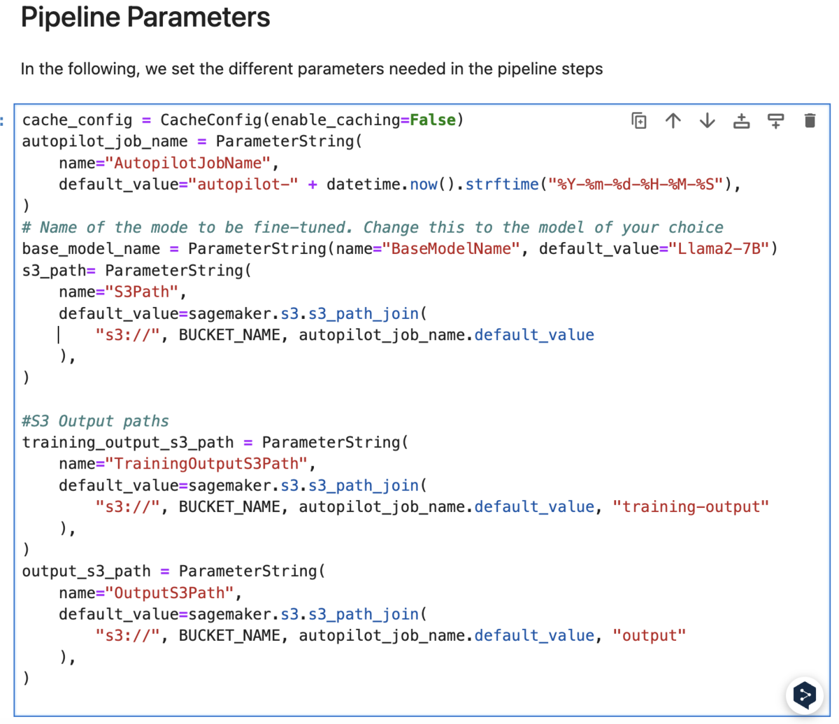 セルを見ると、Llama2-7Bが指定されています。ちなみに執筆時点(2025.01)で、Autopilotでファインチューニングに利用できるLLMは、Llamaが含まれるMeta系のLLMと、Hugging Face系のLLMのみとなっています。(この選択肢が、個人的にはちょっと物足りないですね...)