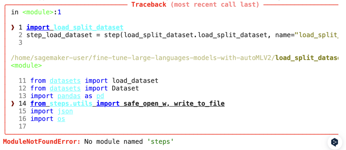 もしこのエラーが起きた場合には、ノートブックではなくload_split_dataset.pyの「from steps.utils import safe_open_w, write_to_file」の行をコメントアウトすることで解消します。
