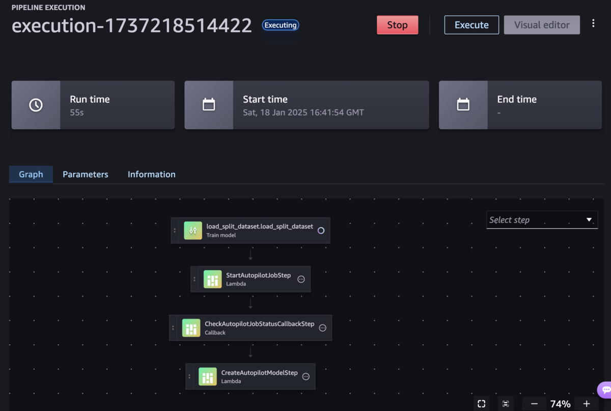 「Create and Run Training Pipeline」で、いよいよMLパイプラインを実行します。セルを実行後、SageMaker StudioのPipelinesから実行履歴を確認できます。