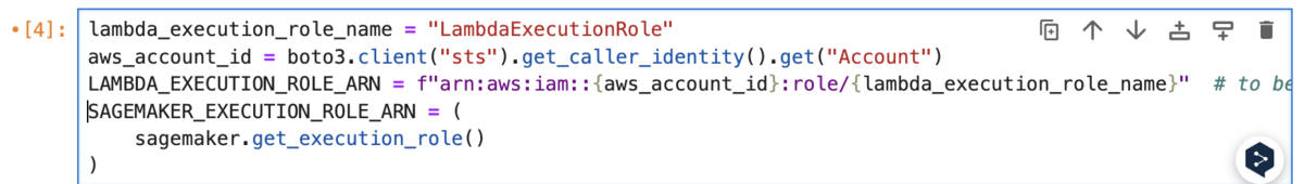 進めていくと、以下のようにIAM Permissionのセルがあります。ここでlambda_execution_role_nameを、作成したLambdaロール名に置き換えましょう。