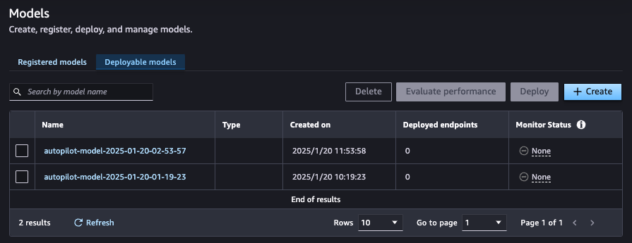 上記パイプラインにて、学習フェーズが完了です。デプロイしたモデルは、SageMaker Studioのモデル一覧から確認できます。