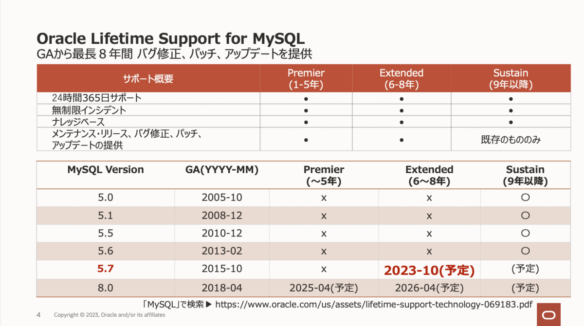 オラクル社では、Oracle Lifetime Support for MySQLとしてGAから最長8年間のバグ修正、パッチ、アップデートを提供しています。