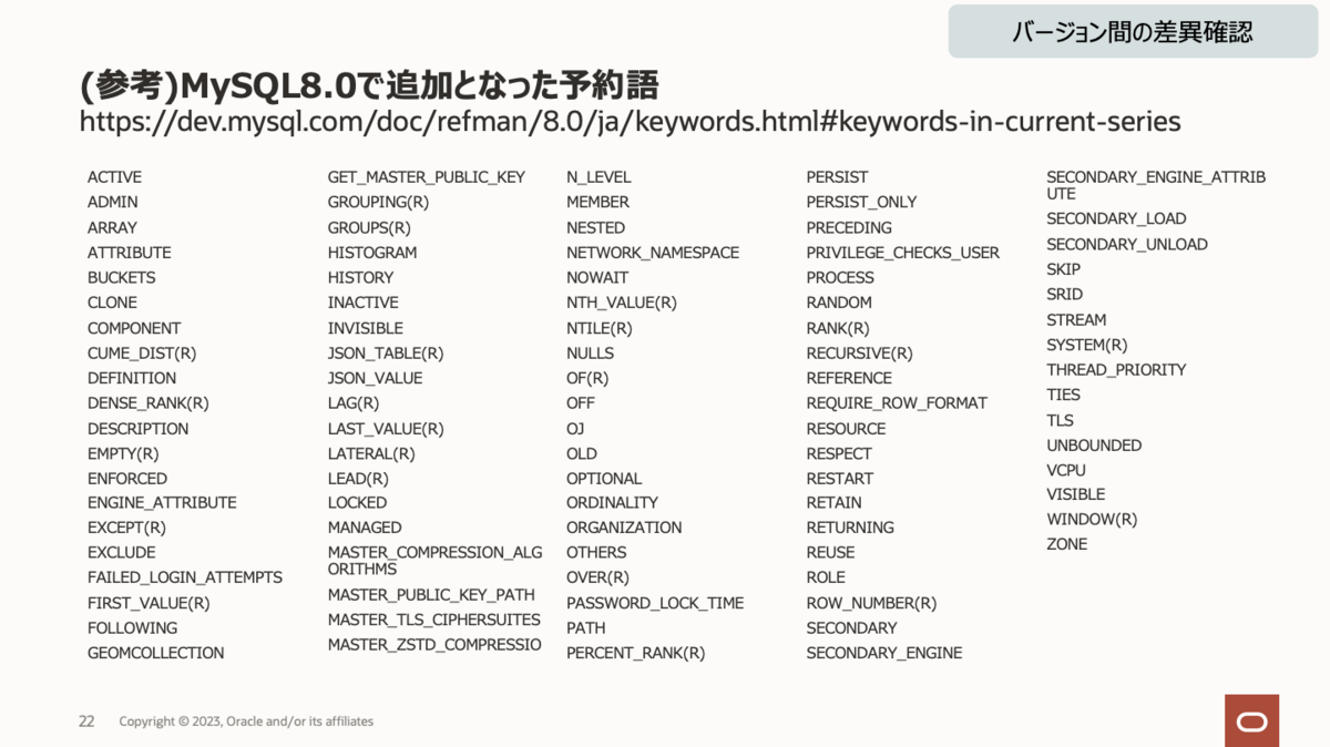 下図は、オラクル社が公開しているMySQL8.0で追加となった予約語の情報となります。