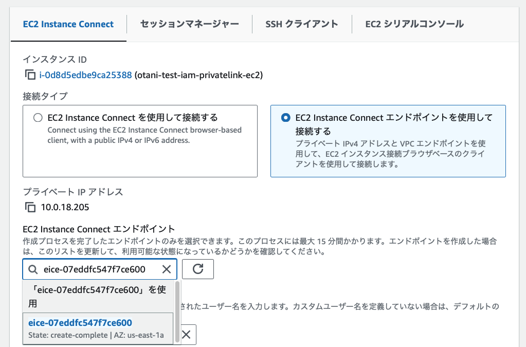 EC2 Instance Connect エンドポイントを経由して、プライベートサブネットのインスタンスに SSH 接続できました。