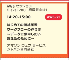 各時間帯に何かしら機械学習関連のセッションがあり、初級者向けのLevel 200が多くスケジュールされていることから、AWSとしても機械学習系のニーズを今後積極的に取り込んでいこうとしているのかなと個人的に感じました。覗いてみたのは以下のセッションです。