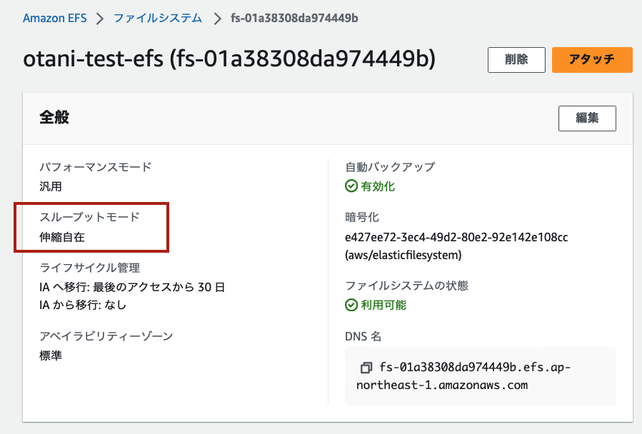 - 簡易デプロイ機能で出来上がった EFS は、Elastic Throughput モードでデプロイされました。