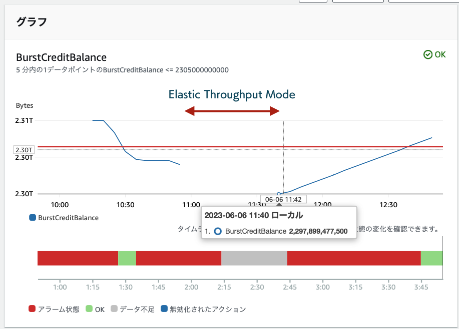 クレジットを減らした状態で、Elastic Throughput モードに切り替えましたが、クレジットのメトリックが出力されなくなりました。その後、バーストモードに戻すと、再びメトリックが記録されるようになりました。