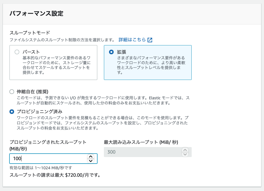 100MiB/秒でプロビジョニングした場合