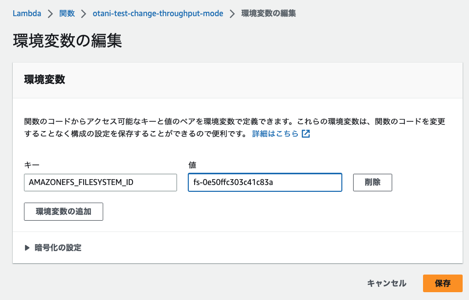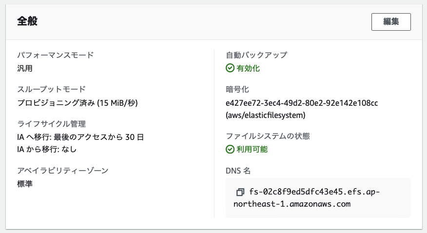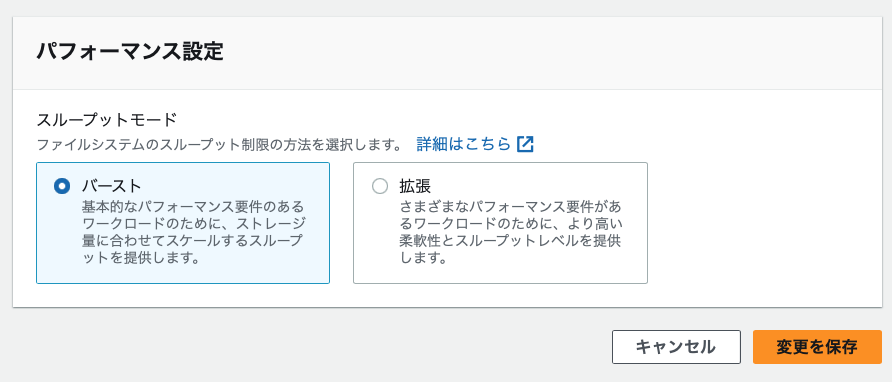 - EFS の [編集] ボタンをクリックし、スループットモードを [○ 拡張] から、