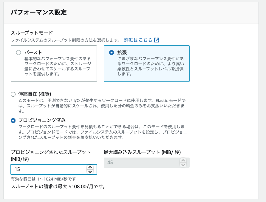 - バーストからプロビジョンドへの変更も試しておきました。[○ 拡張] を選択して、[○ プロビジョニング済み]、15MiB/秒 に変更しました。こちらも即時変更されました。