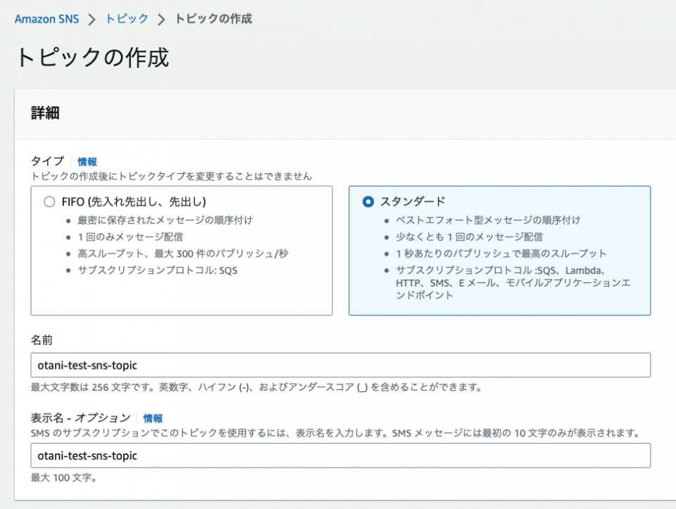 - スタンダードトピックで、任意の名前をつけてトピックを作成しました。