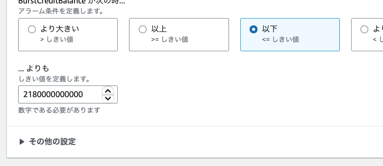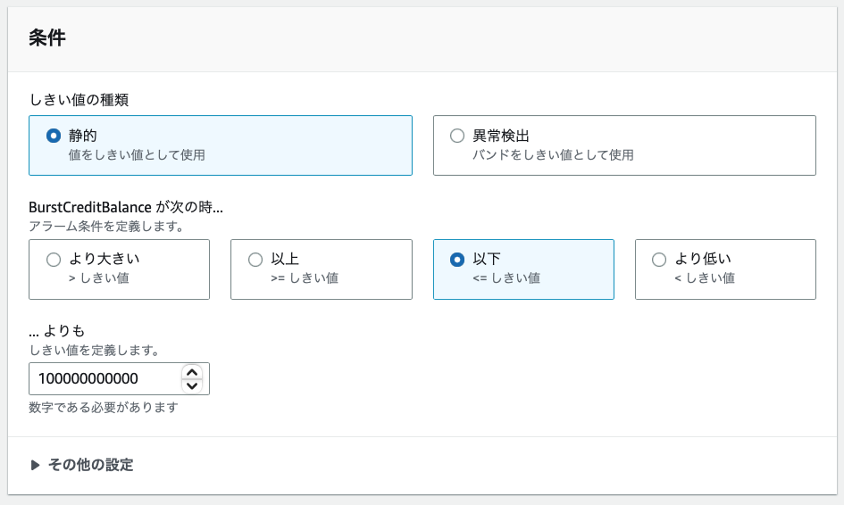 - CloudWatch Alarm は 5 分の最小を指定して、100,000,000,000 以下になったらトリガーするアラームを設定しました。