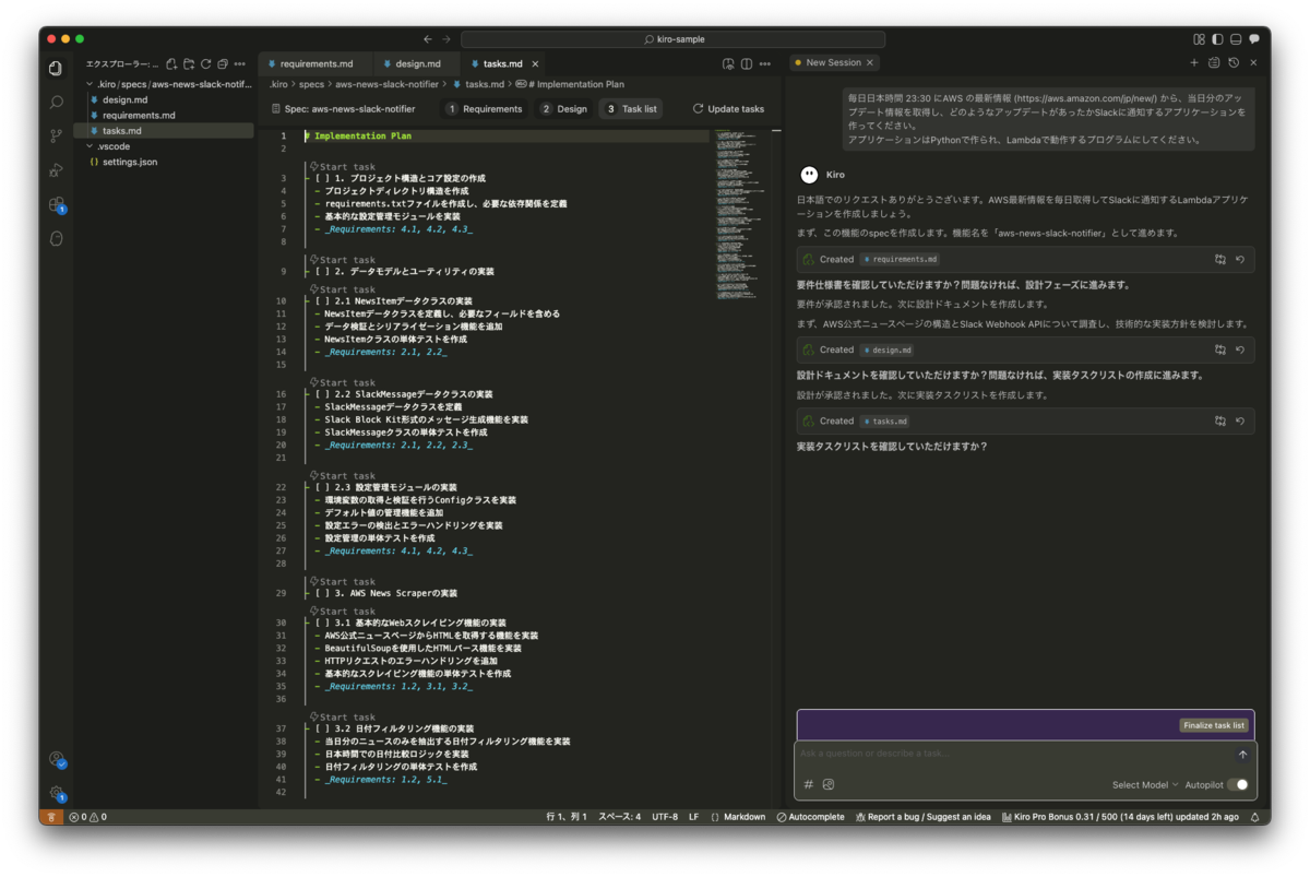 tasks.md の1番目のタスクに「Kiroのタスク実行ログを日本語で出力する」、「ドキュメント、コードコメントは全て日本語にする」を追記してタスクを実行します。