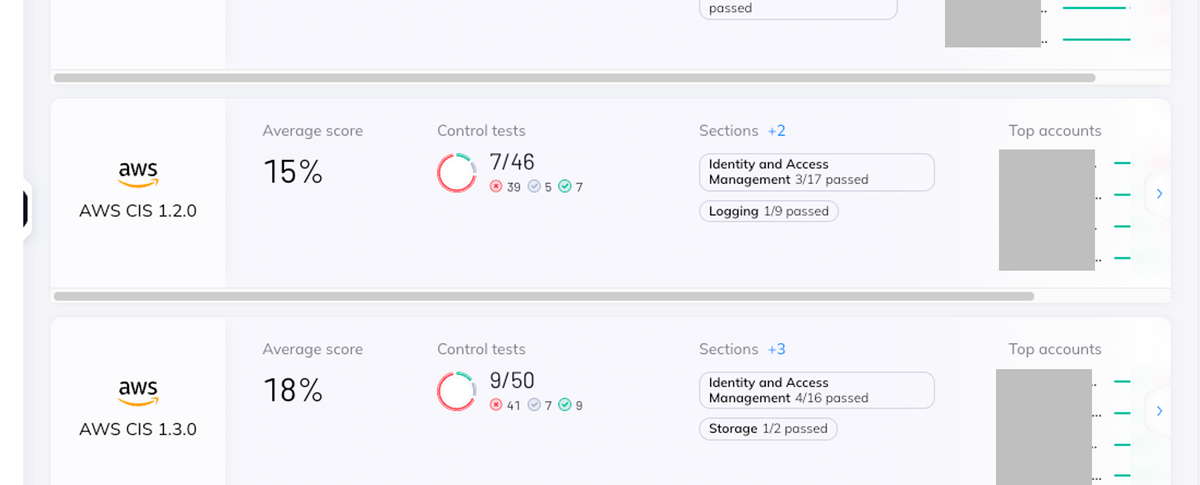 なお、CIS AWS Foundations Benchmark v.1.2.0 では見つけきれませんでしたが、手動アクションが必要なコンプライアンス チェック、または Orca の範囲外のコンプライアンス チェックは Unscored の下に表示されます。