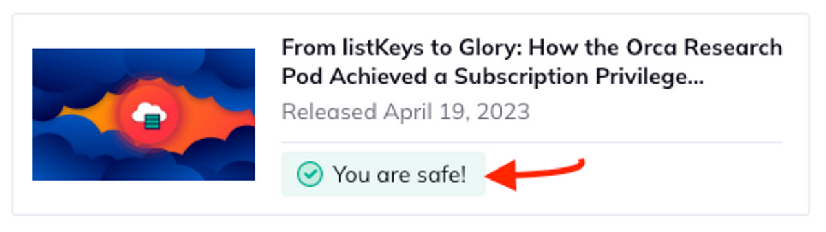 例えば、以下は Azure ストレージアカウントキーを悪用して複数のストレージにアクセスができてしまう脅威を Orca Security が発見していますが、この問題が発生していない場合は「You are safe!」が表示されます。