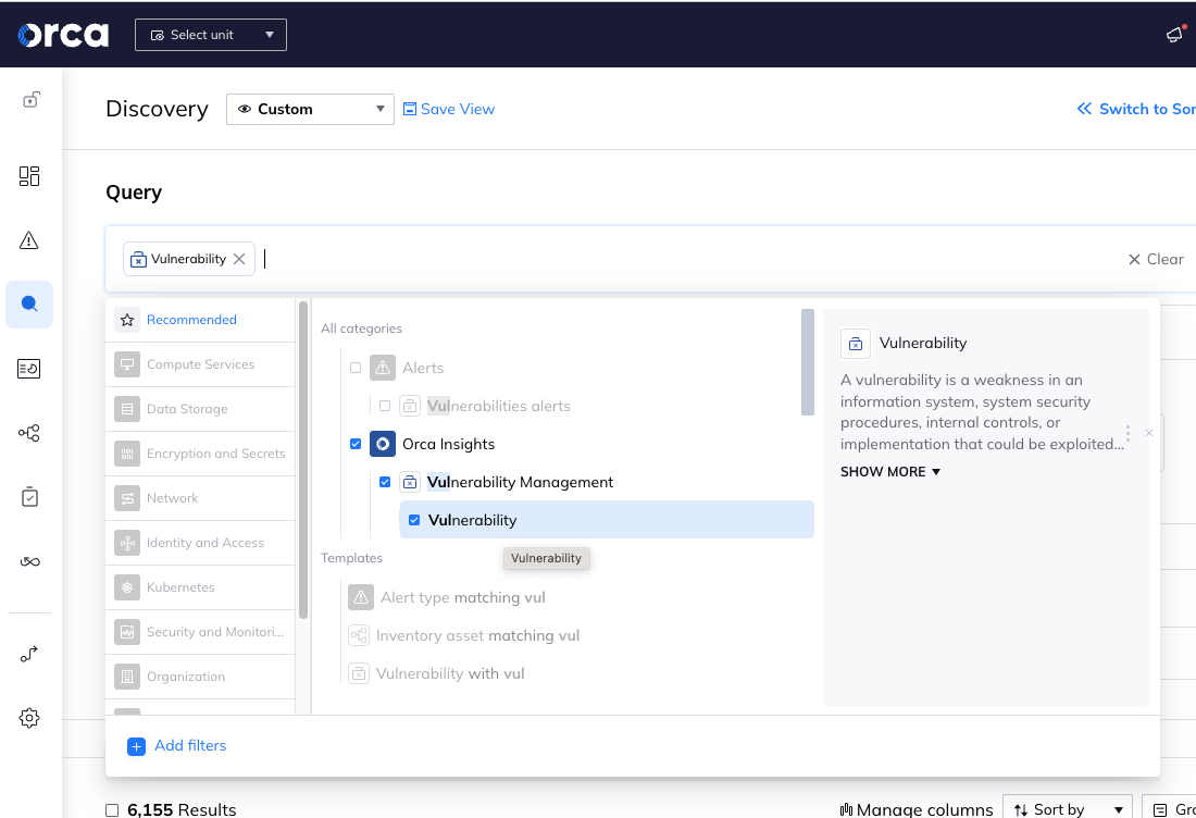 現段階で、Orca Security は、スキャンしたアカウントにて検知した脅威のみが表示され、特定の脅威を検知する機能があるかどうかを判断するための検索機能はなく、データベースも公開されていません。