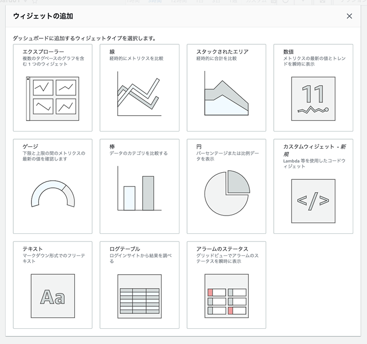 [ ダッシュボード作成 ] ボタンをクリックすると、ウィジェットを追加するウィザードが表示されます。