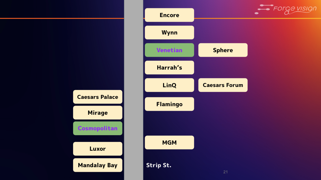 僕たちフォージビジョンのメンバーはコスモポリタンというカジノホテルの近くのコンドミニアムで合宿スタイルで生活していて、僕はそこからメインの Venetian ではなく、サブの会場にばかり行っていたので、日中は現地に来られている皆さんとお会いすることがありませんでした。