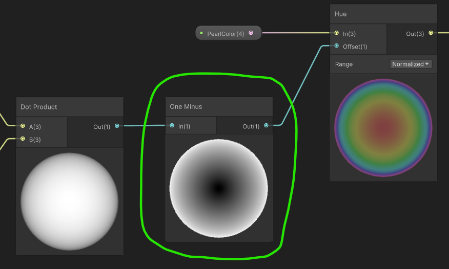 以下の例では、Dot Productノードの結果をOneMinusノードで反転して、正面から輪郭に向かって変化する色相を逆向きにしました。