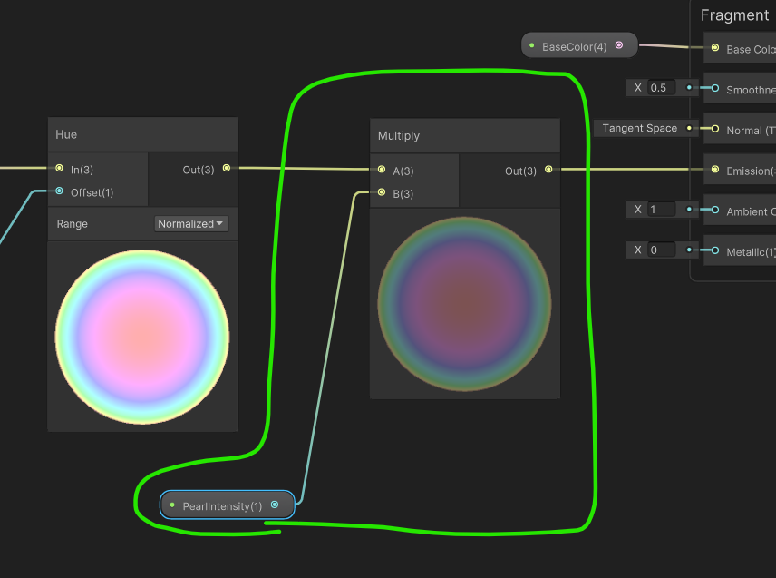 ②の部分では、Hueノードで、入力されたPearlColorの色相を①の値だけずらすことで、正面から輪郭に向かって色相を変化させました。